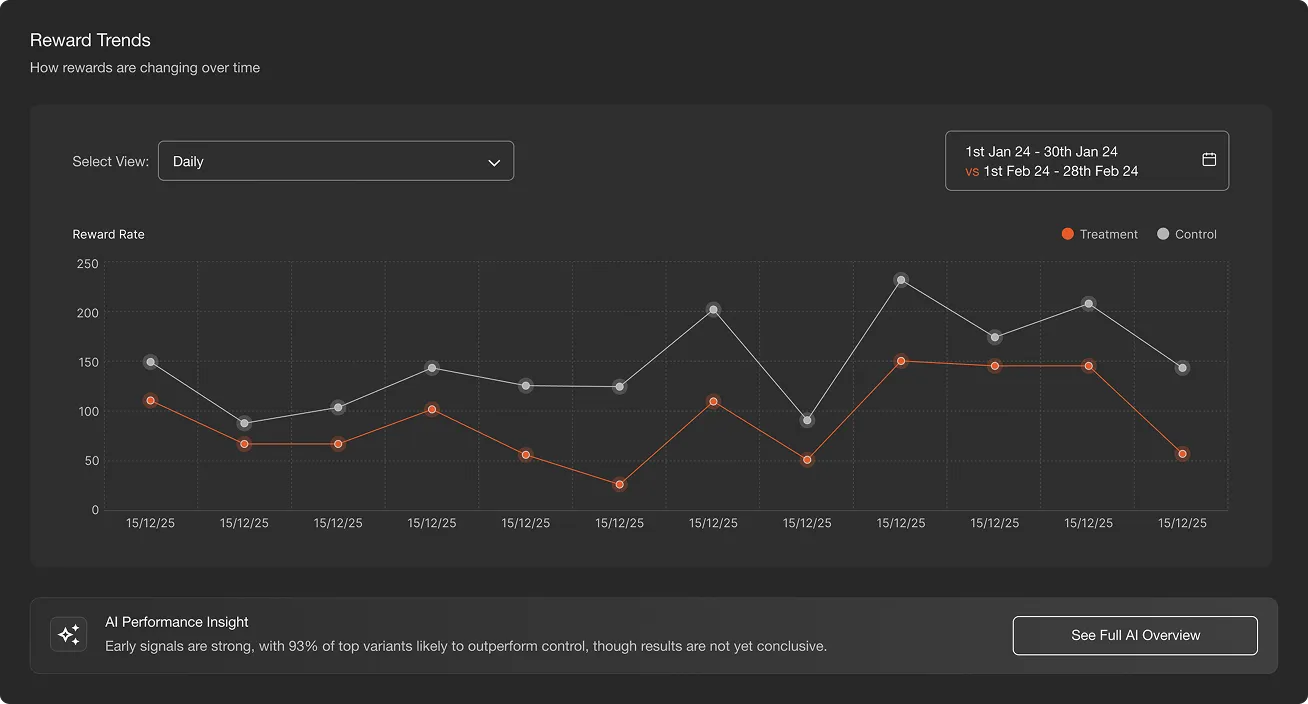 You can see the learning phase the agent is in, probability to beat control, projected impact, and how decisions change over time. This can inform future campaigns, as well as your own hypotheses.