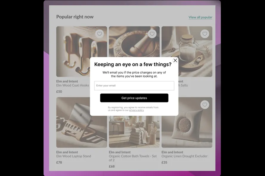 Deliver email capture at the right times. Power in platform or by triggering your other tech. Fewer predefined pop-ups, 40% more sign-ups.