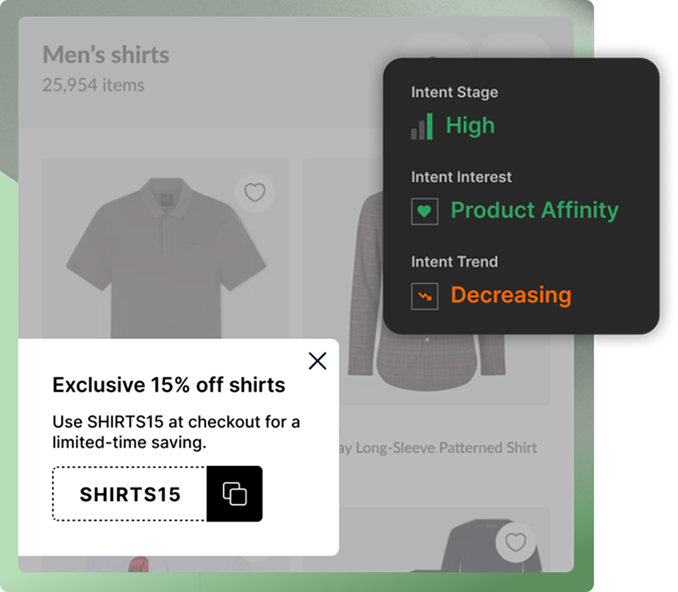 Deliver unique, intent-based voucher codes. Even change incentives to fit visitor interests. Get more sales and save 42% on margin.